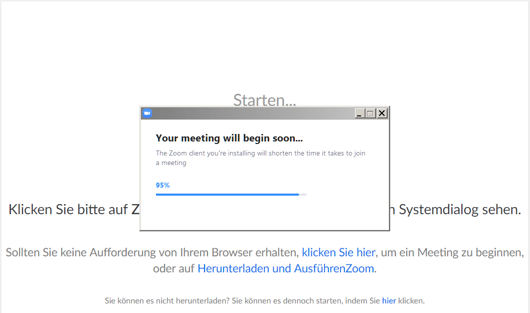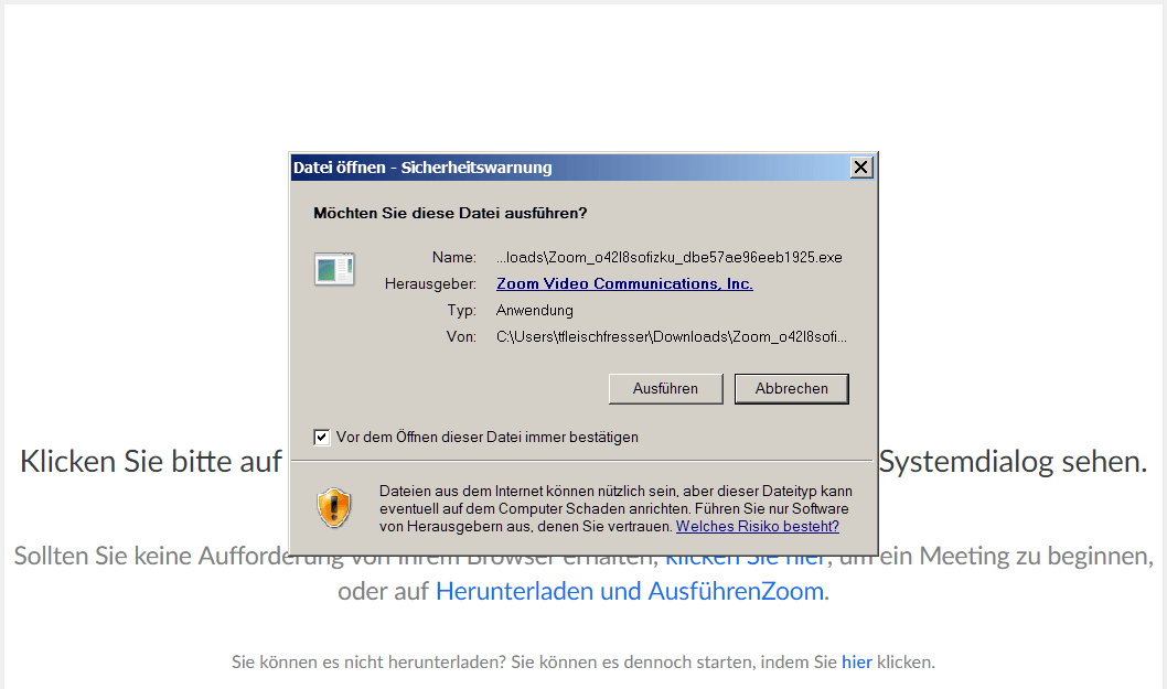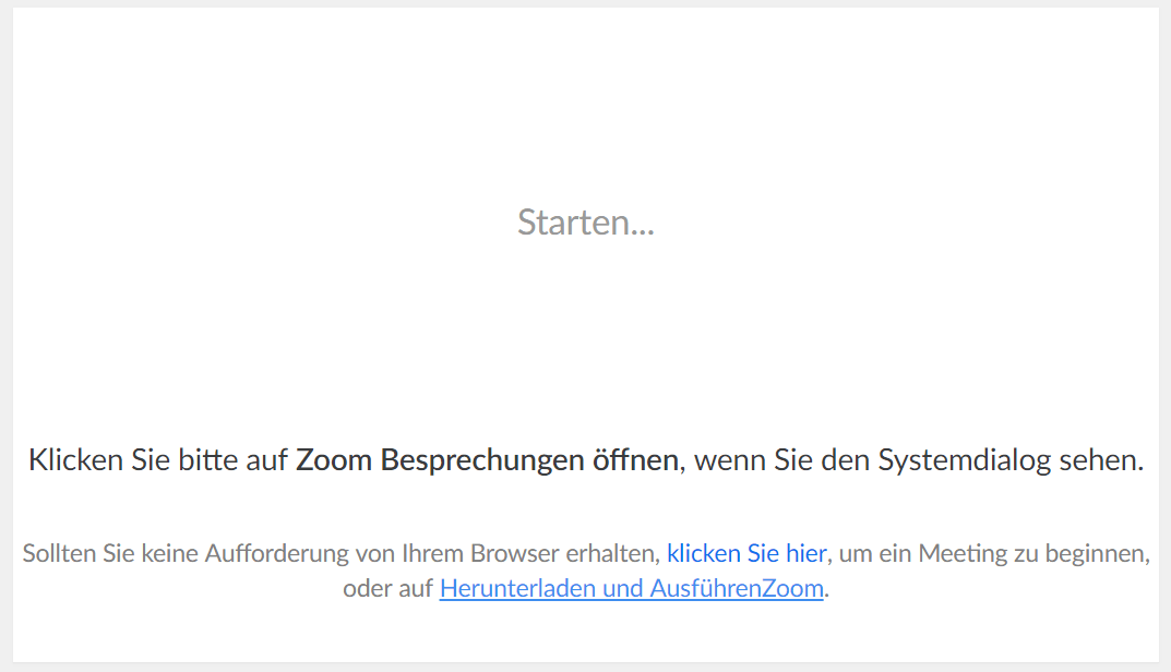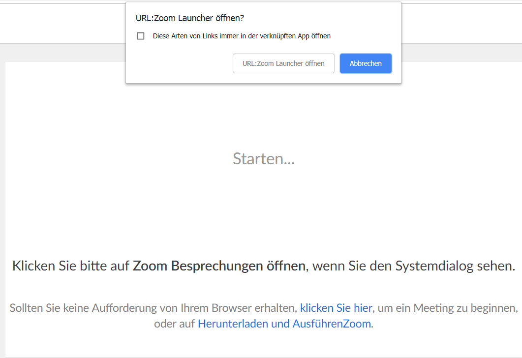 - Wenn ihr noch nie mit Zoom gearbeitet habt, öffnet sich in der Folge ein Dialog, in dem ihr die Möglichkeit erhaltet, den Zoom-Client herunterzuladen und auszuführen (Bild 2). Klickt hier auf "Herunterladen und AusführenZoom".